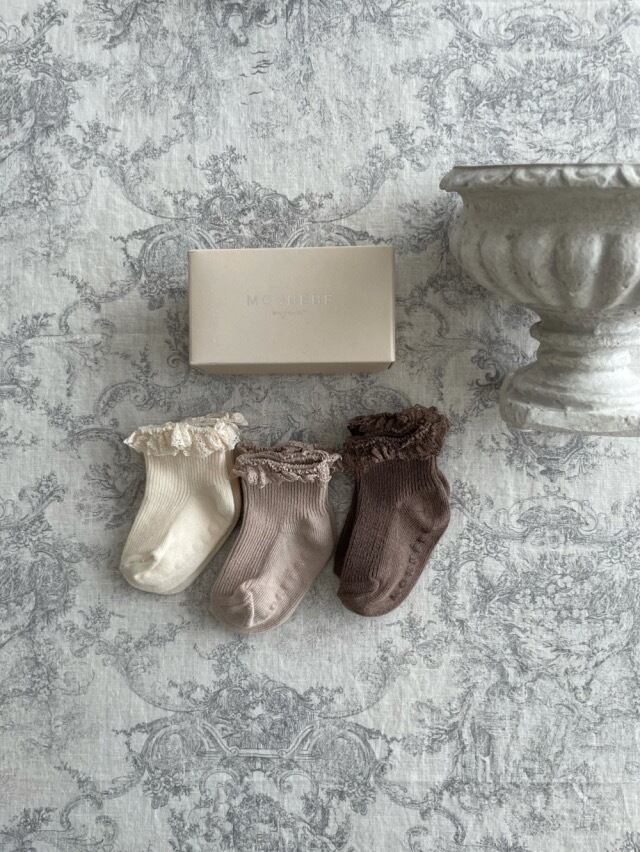 フリルが可愛く箱もお洒落なベビーソックスです☆とても可愛いらしい靴下で、出産祝いなどのプレゼントにもおすすめです◎monbebeロゴの滑り止めつき❤︎︎ ˊ˗